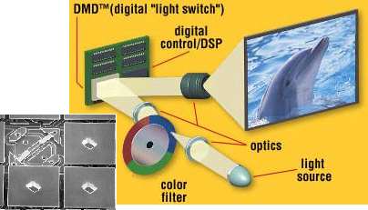 Si quelques succes dans le domaine des MEMS capteurs (pression et acceleration) ont reussi a faire vivre une industrie, les MEMS optiques attendent toujours leur produit phare. La realisation la plus citee est le Digital Mirror Device de chez Texas Instrument, qui est constitue d'une matrice de centaine de milliers de miroirs bistables permettant la projection d'image. Une source de lumiere externe eclaire la surface de la matrice et chaque miroir reflechi la lumiere vers l'ecran ou vers un stoppeur selon sa position. Ainsi, en envoyant des impulsions de duree variable a chaque miroir (PCM), on fait osciller le miroir entre ses deux etats fondamentaux et l'on obtient une modulation de l'intensite lumineuse reflechie, independante pour chacun des pixels/miroirs de l'image.